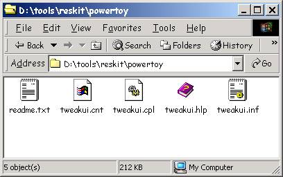 TweakUI is stored in \tools\reskit\powertoy. Double-click on the tools icon, then double-click on the reskit icon, and finally double-click on the powertoy icon.