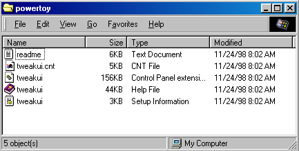 - TweakUI is included on the Windows 98 CD. The figure to the right shows a directory listing of that CD.
