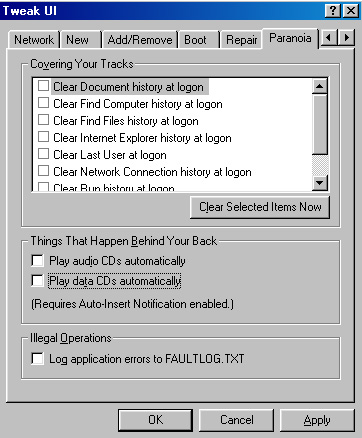Aptly named! This lets you automatically cover your tracks by emptying the lists of Recent Documents, Run, Last User, and more whenever the system restarts. Nice to set on computers used by multiple users– so Johnny doesn’t get to see what documents Mary was working on. As well, for no good reason, you can set audio and data CDs to play automatically–or not. (Note–for this to work, you need to have Auto-Insert Notification turned on– If this isn’t working for you, go to the System control panel, and go to the Device Manager tab. Find your CD-ROM drive in the list of devices, select it, and click the Properties button. Go to the Settings tab and make sure [x] Auto-Insert Notification is checked.